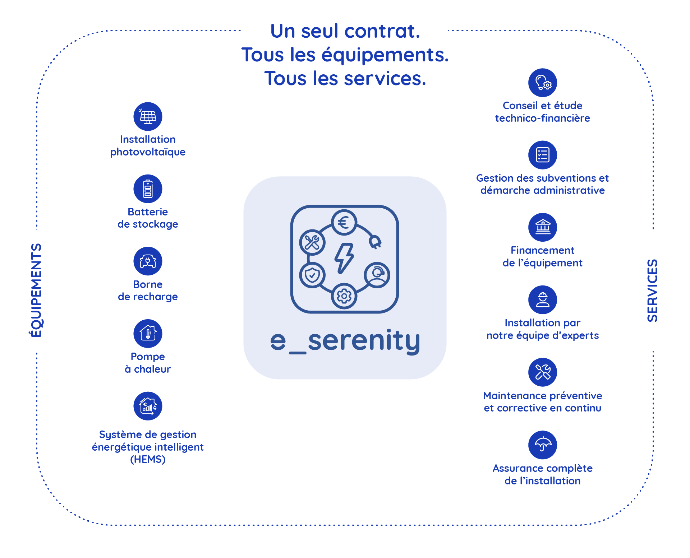 Avec e_serenity, accédez à l’ensemble de nos solutions énergétiques sans investissement initial, tout en gardant l’esprit tranquille : electris s’occupe de tout pour une mensualité fixe et maîtrisée.